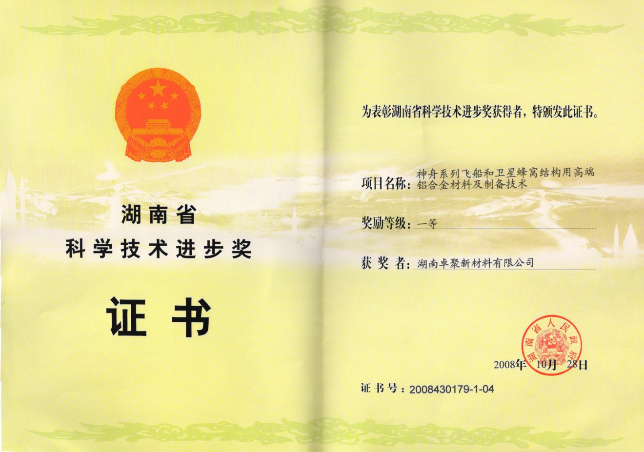 近日,由公司承担的研发项目:神舟系列飞船和卫星蜂窝结构用高端铝合金材料及制备技术,喜获湖南省科学技术进步一等奖。